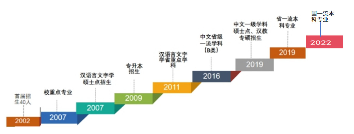 汉语言文学专业2002年开始招生,现已发展成“省一流学科”“一级学科硕士点”“ 国一流专业”并驾齐驱的喜人局面,其发展沿革的关键节点如下图: