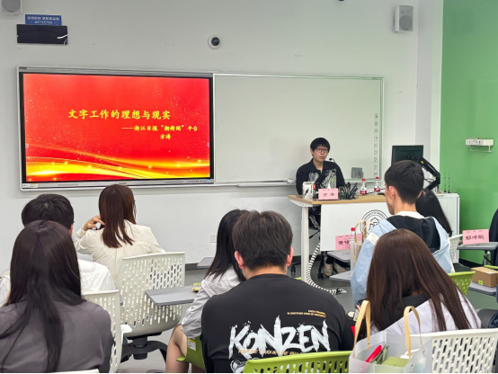 颁奖仪式结束后,浙江日报“潮新闻”平台的记者方涛,作了题为“文字工作的理想与现实”的讲座。他分享了行业的发展状况、从业者应具备的能力素养等,并从媒体一线从业者的角度,对爱游戏 人才培养、学生的自我锻炼、创作需要注意的事项等方面提出了意见和建议。作为本次大赛的评委,他有针对性地对同学们的作品作了评价,提出了进一步修改提高的建议。讲座过程中,他还与同学们就创作、就业等话题进行深入交流,鼓励同学们利用闲余时间积极锻炼自己,勇于尝试,挖掘自己在文字工作方面的兴趣与热爱,把握每一个自我提升的机会,丰富自己的实习经历。