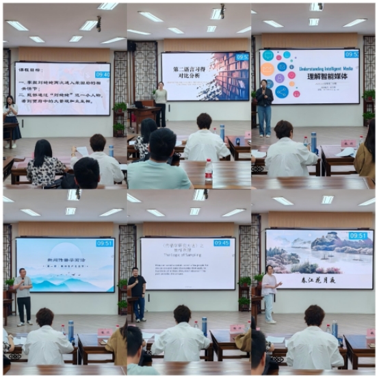 郁冲聪老师带来了“穿针引线的刘姥姥——红楼梦中的小人物与大景观”的教学;魏阳阳老师以“问题导入”的方式讲解“第二语言习得对比分析”;郝文琦老师结合“元宇宙四象限论”讲授“理解智能媒体”;王彬老师从社会学角度引入“新闻传播学前沿”;季诚浩老师对《传播学研究方法》中的“抽样原理”进行了精彩讲授;虞越溪老师以提问互动方式讲解“大学语文·春江花月夜”;