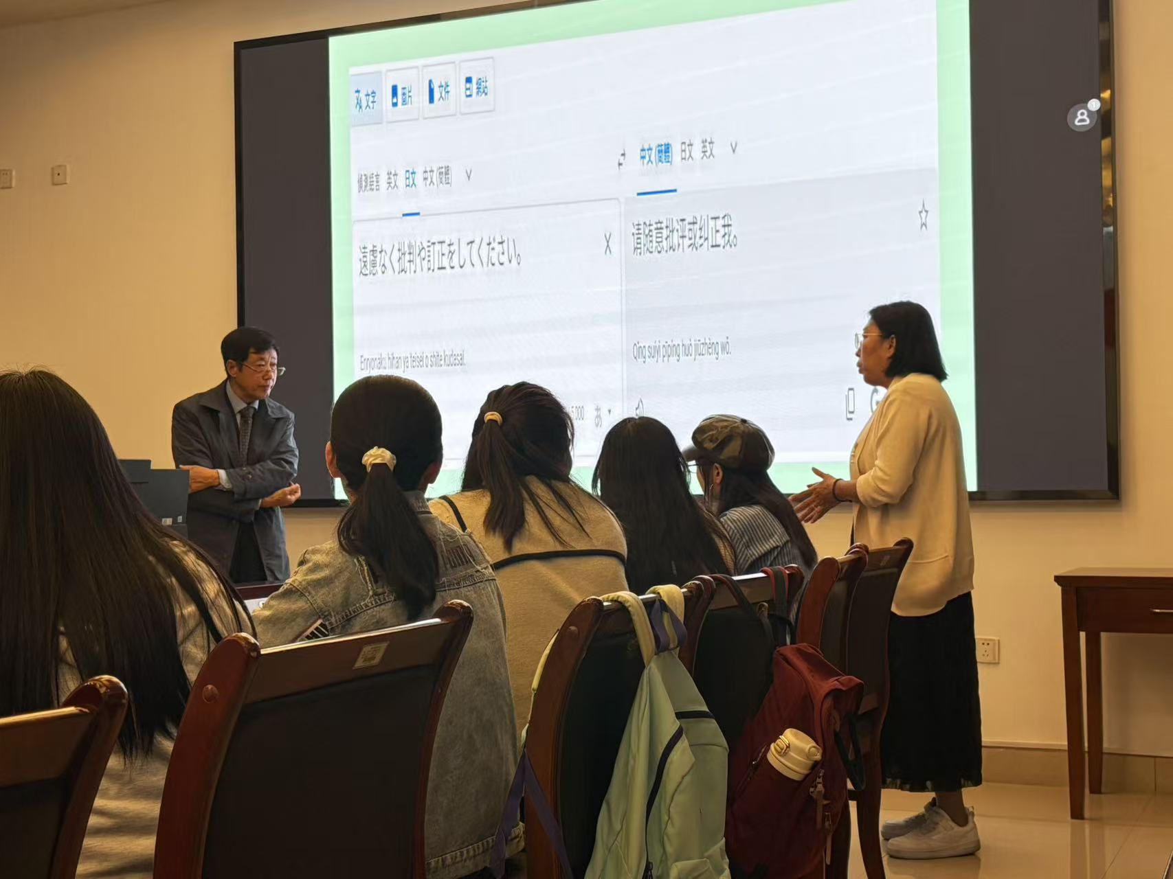 讲座开始前,付伊老师向同学们介绍了王占华教授。讲座开场,王占华教授并未赘述AI的成就,而是另辟蹊径,通过一系列生动有趣的AI“翻车”误译案例,迅速抓住了全场听众的注意力。从现实生活出发,将从日语词汇用翻译软件翻译成中文时发生错误的尴尬,到在处理复杂句法时产生的逻辑混乱,这些案例引发了现场阵阵会心的笑声,也引出了讲座的核心问题——从AI的误译看语际语言学研究的新课题。