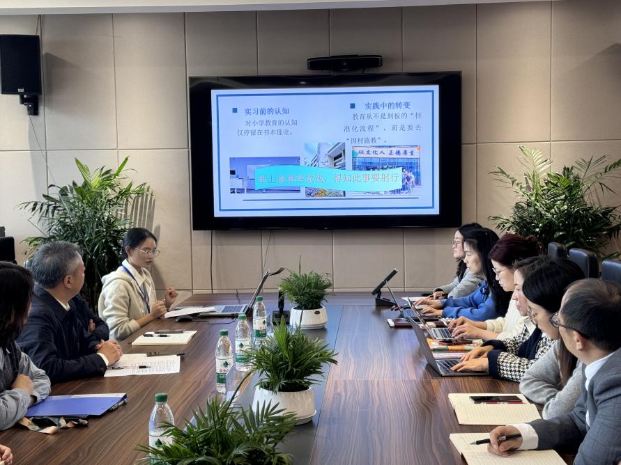 分享会伊始,首先由担任本次实习生小组组长的竹欣瑶进行经验分享。她从教育认知、教学实践、总结与展望三个部分分享了这一个月实习的收获,深刻感受到“教育是‘一个灵魂唤醒另一个灵魂’的艺术”。