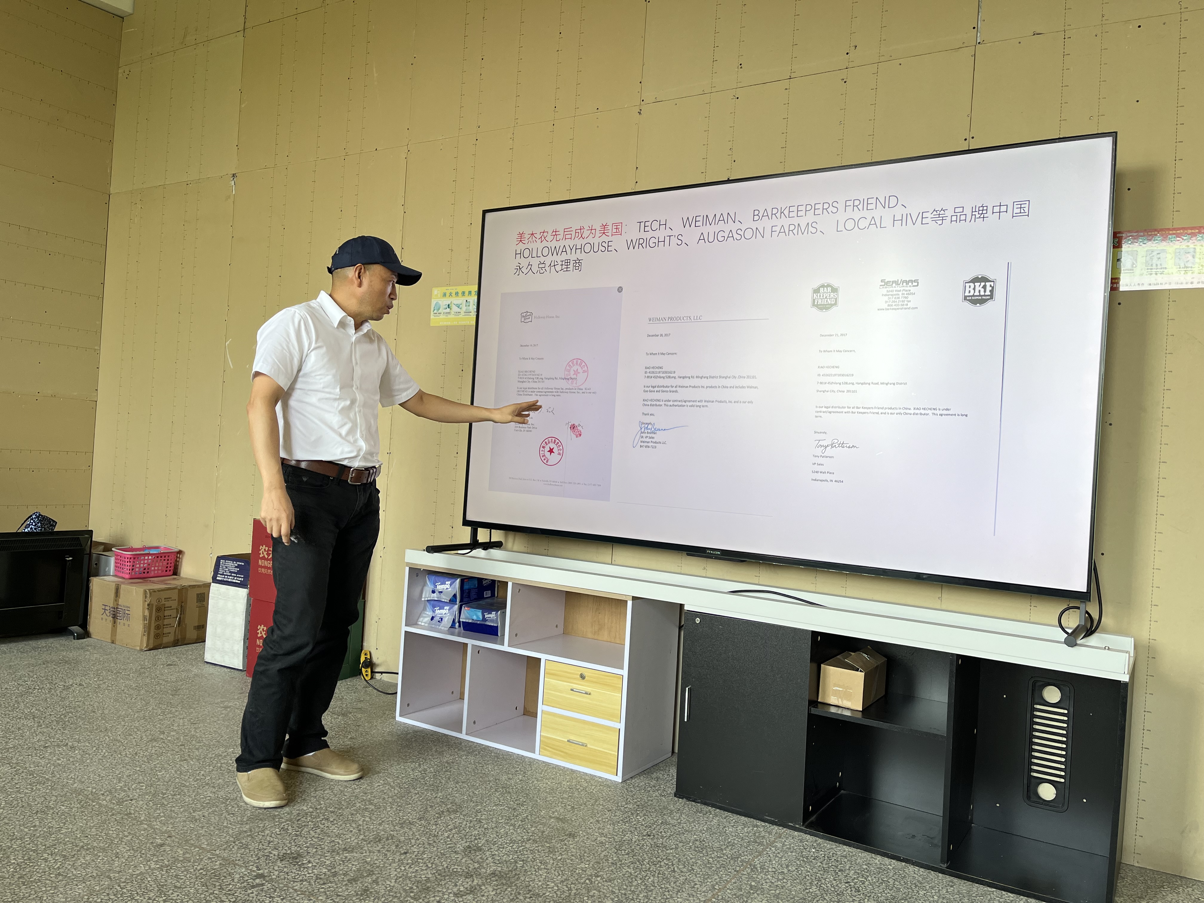上海碧恺福商贸有限公司成立于2008年,主要经营洗涤设备及用品、货物进出口等业务。肖和成董事长一边介绍公司发展情况的同时,一边讲述自己一路走来的心路历程。从货架时代到电商时代,再到时下流行的直播带货,他强调,在当今快速变化的市场环境中,行业市场的敏锐度是企业成功的重要因素之一。