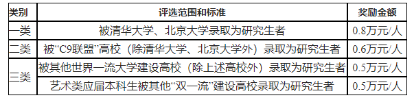 国内奖学金用于奖励普通类应届毕业生被国内名校录取为研究生。根据教育部最新发布的世界一流大学和一流学科建设高校及建设学科名单确定。名校研究生奖学金分为“一类”、“二类”、“三类”,评选范围和标准、奖金金额如下: