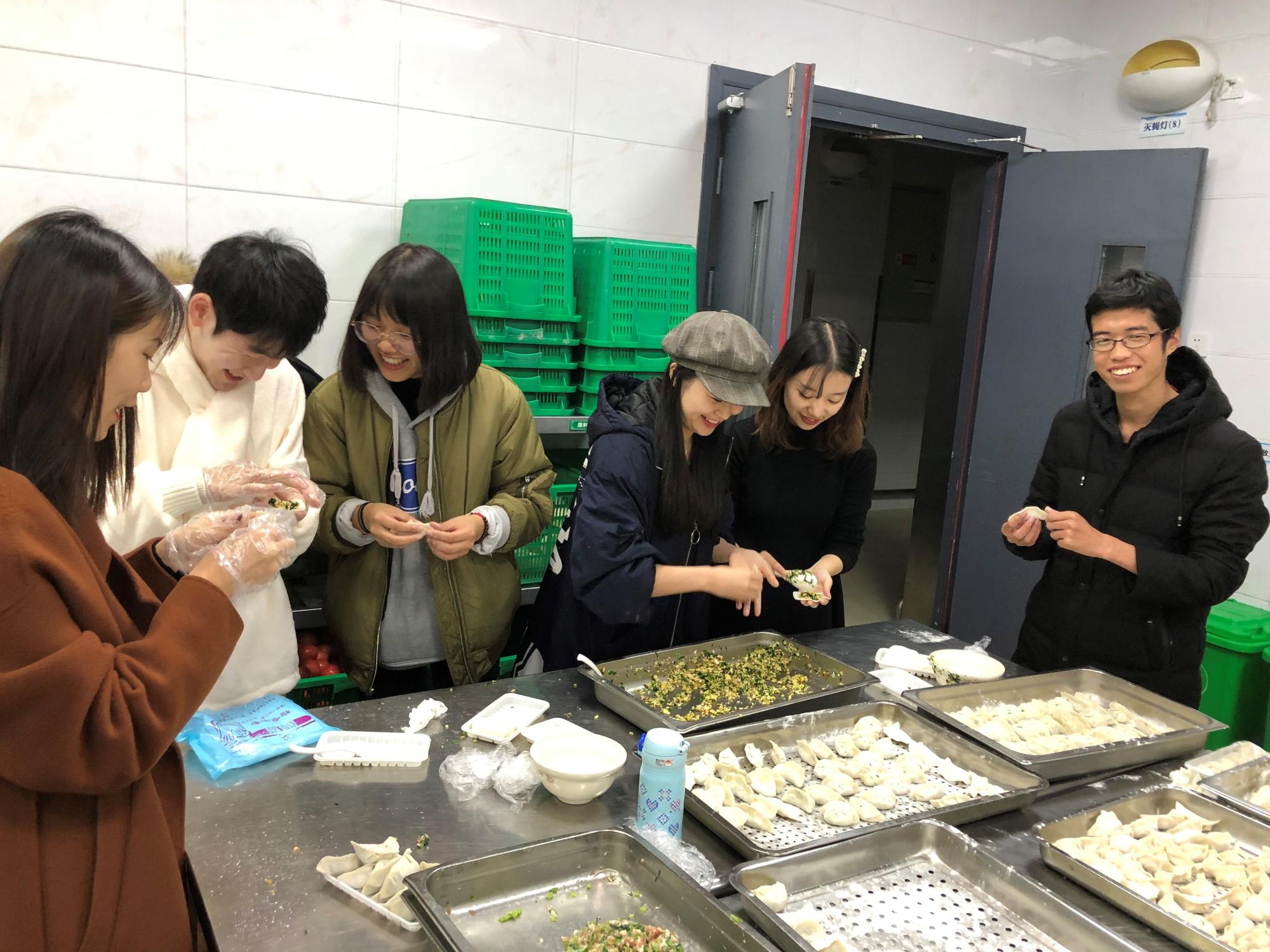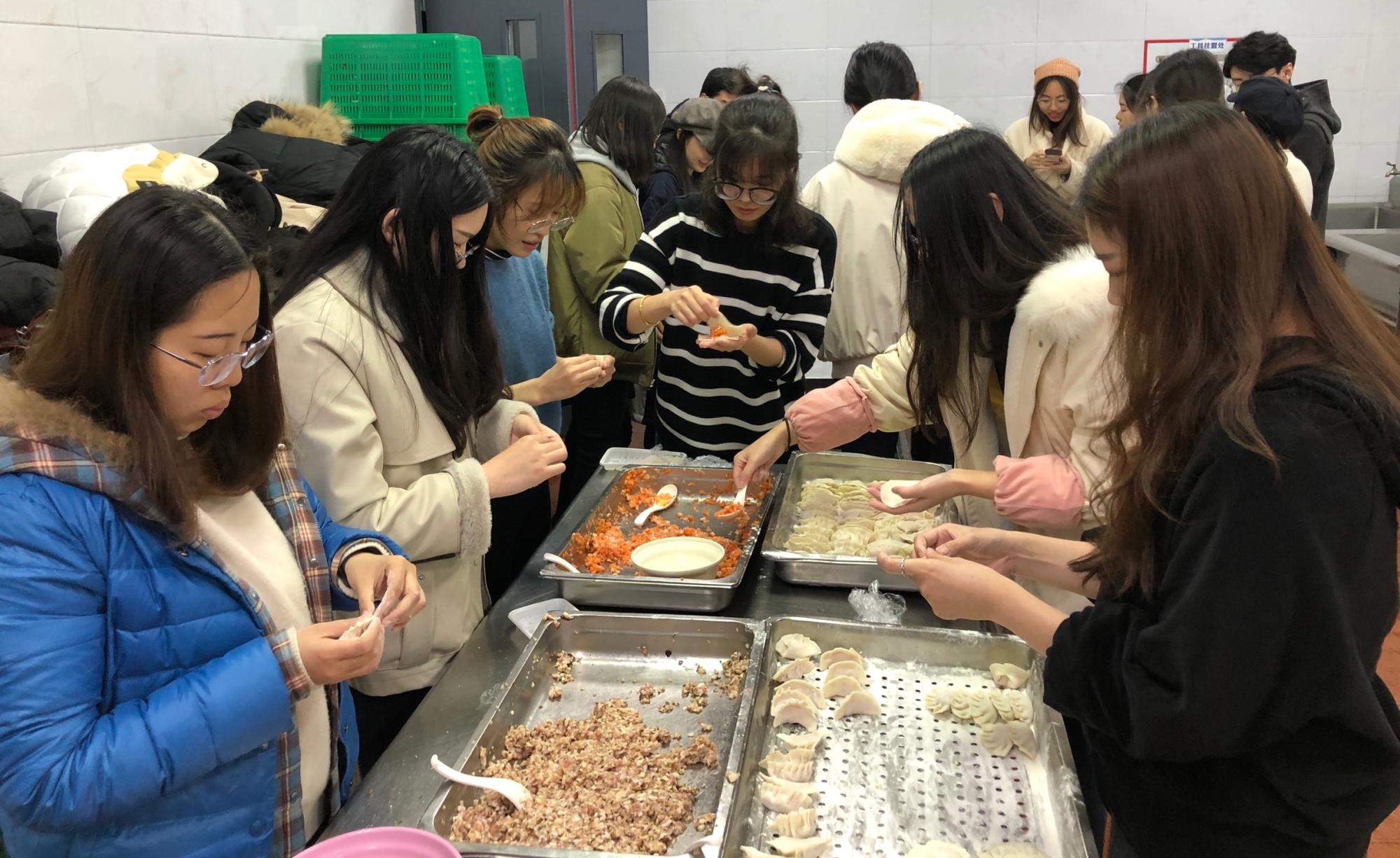 19日上午,负责采买的同学一大早去超市选购包饺子所用食材,在食堂经理与主厨的指导帮助下,同学们分工合作,洗菜、切菜、调馅,大家热情高涨、气氛活跃,围在一起包饺子、煮汤圆。当一盘盘热饺和汤圆上桌的时候, 同学们脸上都洋溢着幸福的笑容。