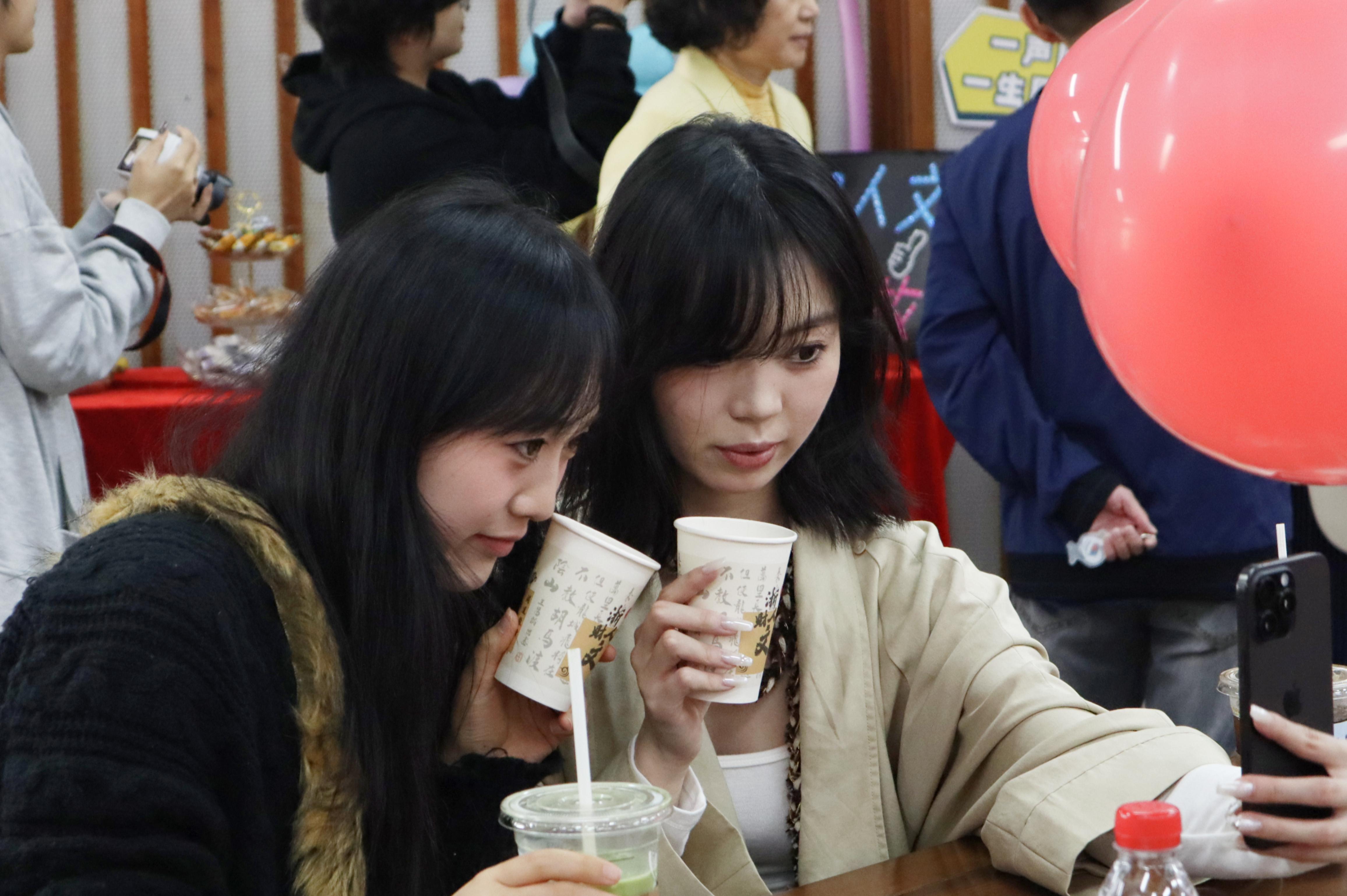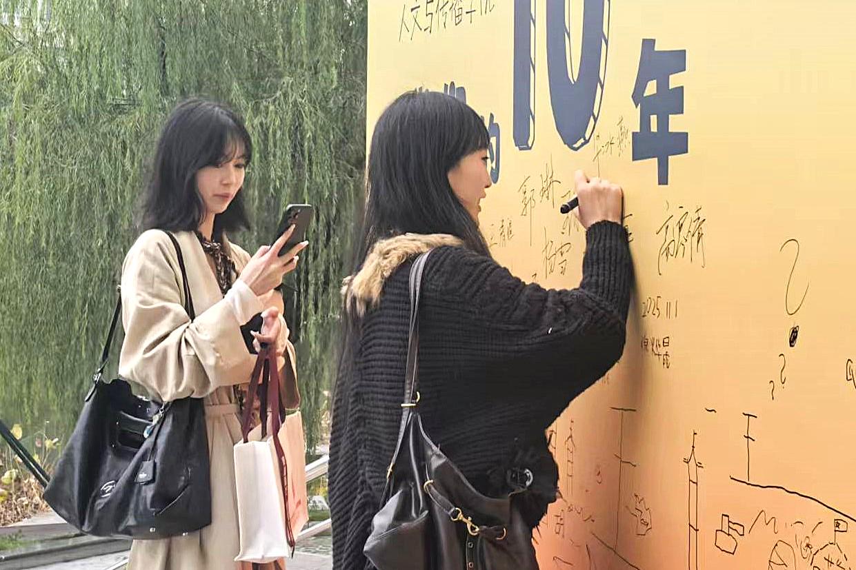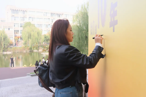 印记的挂件,或是印有人文符号的明信片。再移步至长廊一侧,便是互动区。校友们执笔蘸彩,俯首书写下十年后的星辰与远方,墨迹在纸端游走,将此刻的心绪与期盼一一封存。