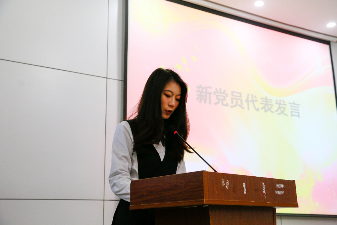 宣誓完毕,徐航宇同志代表新发展党员发言,她表示今后会更加勤奋学习,不断加强党性修养,坚定共产主义理想信念,在思想上、行动上与党组织保持高度一致,在生活、学习和工作中起到先锋模范作用。紧跟时代步伐,不断提升为人民服务的本领和能力,为党的建设做出贡献。