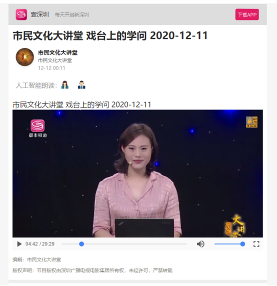 2020年10月25日,爱游戏 毋丹老师受深圳市委宣传部、深圳市社科联联合邀请,作客深圳市民文化大讲堂,开展了一场题为“戏台上的学问和学问中的戏台”的精彩讲座,反响热烈。由该场讲座剪辑制作的电视节目于12月11日在深圳市民频道播出。