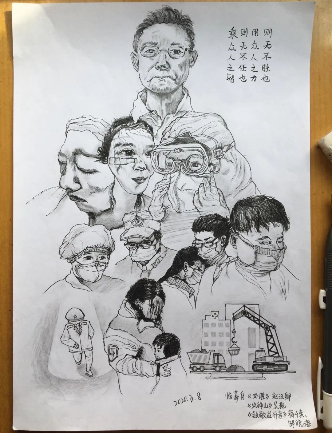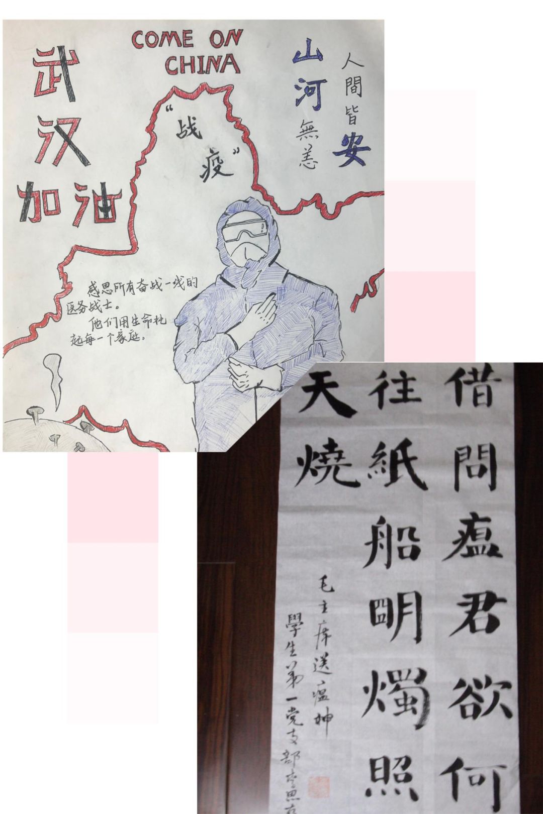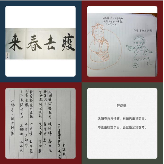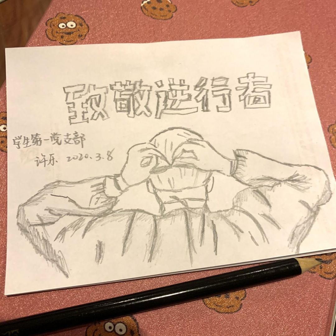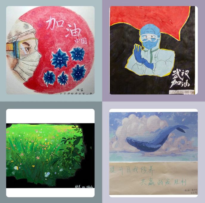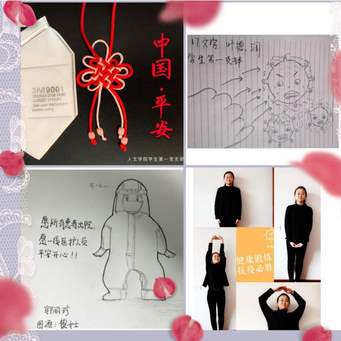 学生第一党支部的党员们也没有停下脚步,在家中积极抗“疫“。他们利用专业优势,结合支部特色,以手中之笔,心中之思,记录疫情期间“在中国,在你身边,你看见了什么,记住了什么,你为什么感动,又为什么彻夜难眠”。着眼于他们的身边,纵观整个疫情事件,立足于党员的责任与付出,用写诗、作画、朗诵等传统文化形式将抗“疫“战展现在所有人面前,携手共同度过抗“疫”的艰难时刻,向一线抗“疫”人员致敬,学习榜样的力量,也从实处做到积极抗”疫“。