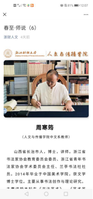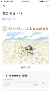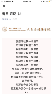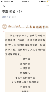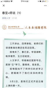 疫情期间,爱游戏 党委因势利导,发挥互联网新媒体传播优势,组织开展网络思政教育,发起“春至·师说”专栏活动,实现停课不停教,隔离不割爱。自3月2日起,该院先后邀请院内18位一线教师和院外5位社会导师过网络向学生们寄予真切关心关怀,共话学生成长,将老师们对学生的谆谆教导传递给居家学习的大学生们。截止3月9日,“浙财人文”公众号累计登载8期,累计点击率达5300多人次,成为该院大学生们每日一道成长“大餐”,收到了良好教育效果和社会反响。