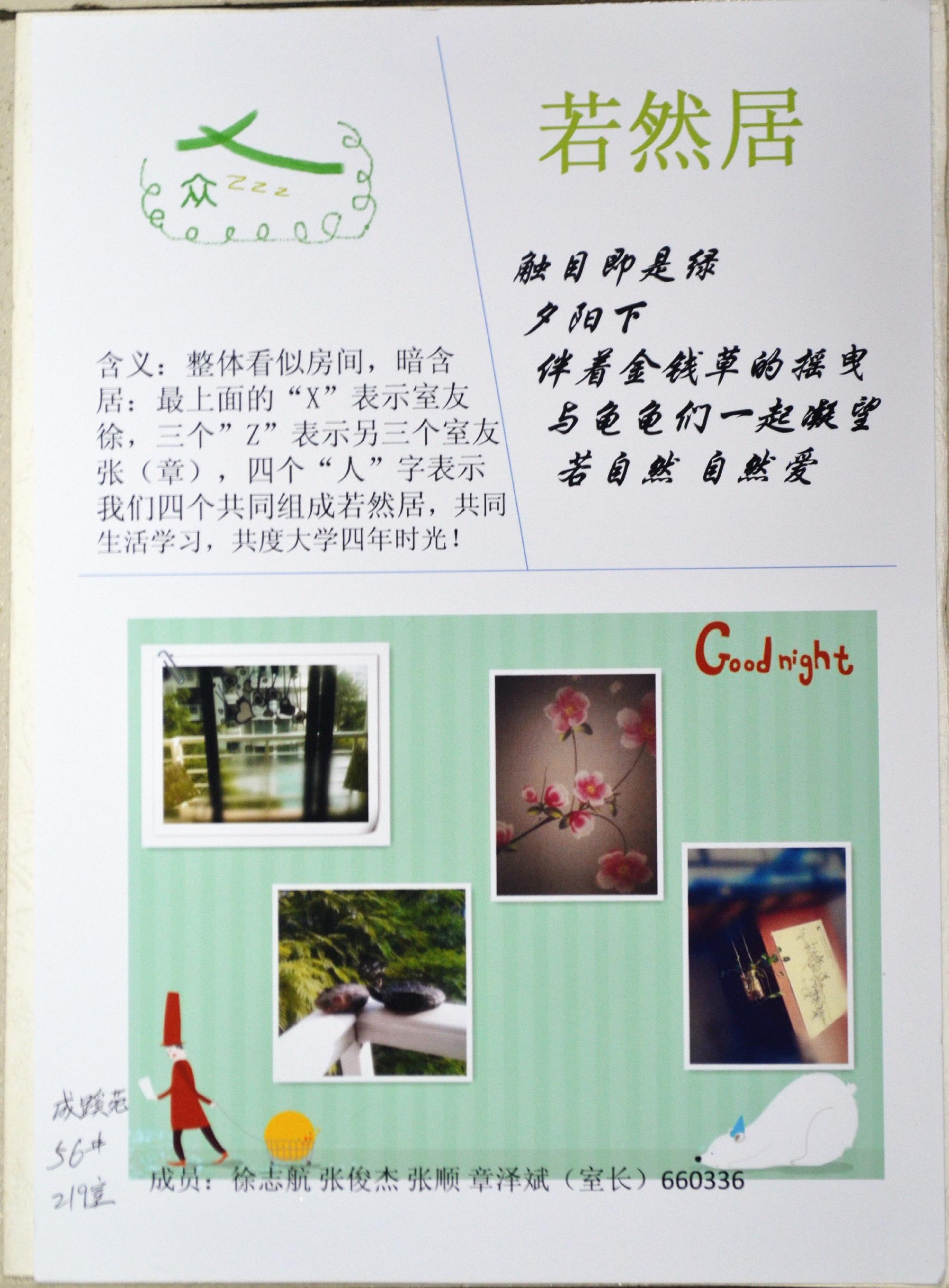 活动要求每个寝室根据寝室成员的特点、爱好及对本活动主题的理解来进行富有个性的寝室设计、装扮;寝室名的个性设计以及代表寝室精神符号的LOGO设计。在参赛作品的征集过程中,同学们踊跃参与,各寝室根据各自对文化寝室主题的理解,对寝室进行了不同的装扮。发挥新颖创意,凝聚寝室力量,打造出一间别具一格的特色寝室。他们为自己的寝室取上一个个独特的室名:“浪漫满屋”、“若然居”、“菜鸟窝”、“杏花微雨”······给人以别样感受。每个寝室还设计了属于自己寝室的室徽,用简约而优美的线条图案,描绘下浓缩了寝室特色的精神符号,并对LOGO的想法进行了详细的描述。