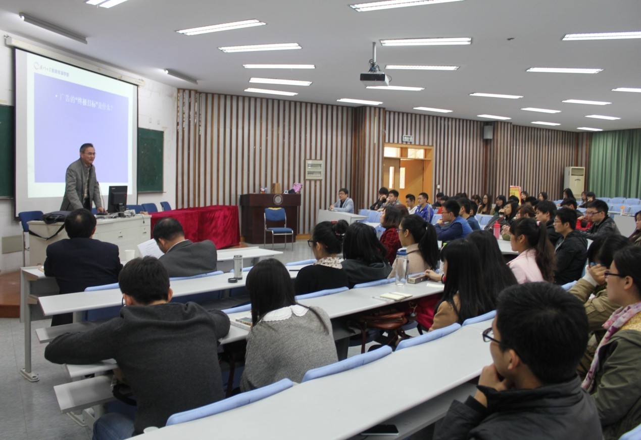 黄教授以其丰富的业界经验及深厚的学术功底,深入浅出地向在座同学阐述了“广告目标及实现路径”这一广告活动中最核心的问题。在讲座中,黄教授将广告的终极目标形象地比喻为要为企业增加“股东资产”。并通过具体的广告实战案例分析了实现这一终极目标的各式路径。