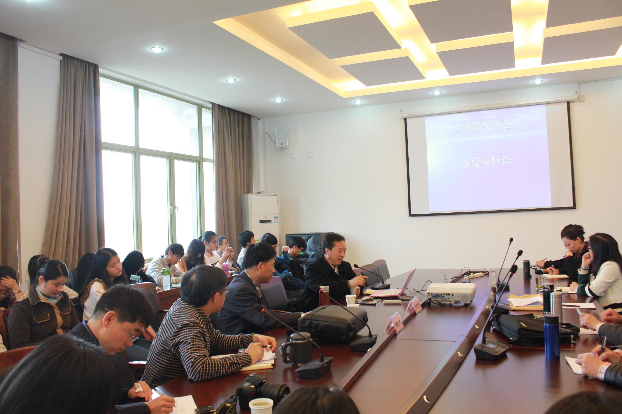 刘晓南教授则以韦昭、刘熙关于“车”字的古音之争为线索,向师生们介绍了上古韵研究的整个历史发展脉络以及现代音韵学发展中的音值构拟和音理解释。他指出音韵学是古代汉语中理论性很强的学科,必然要有理论指导,更要解放思想,注重理论但又不受拘束。