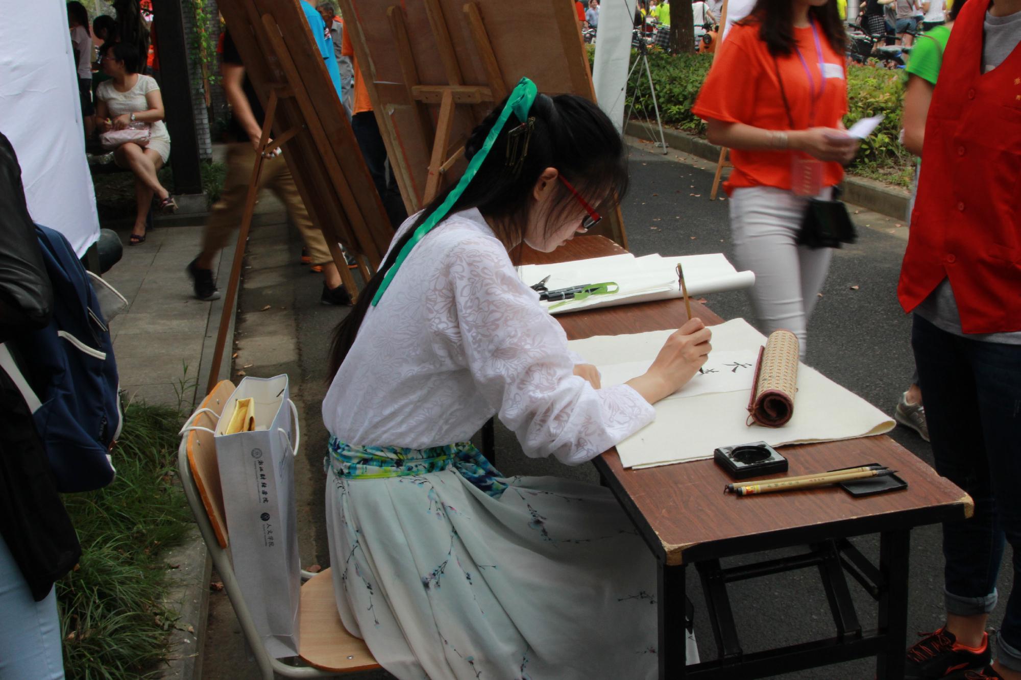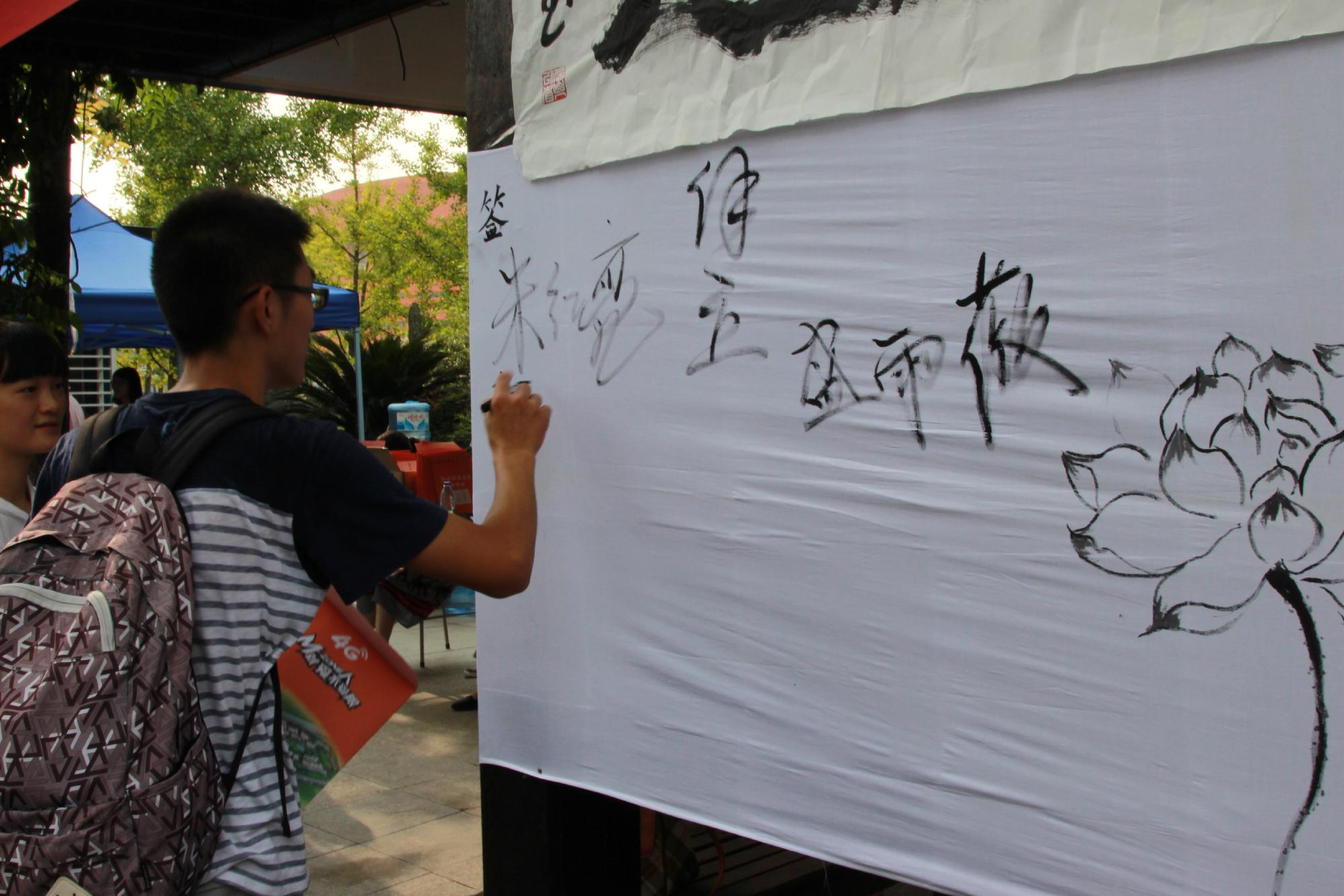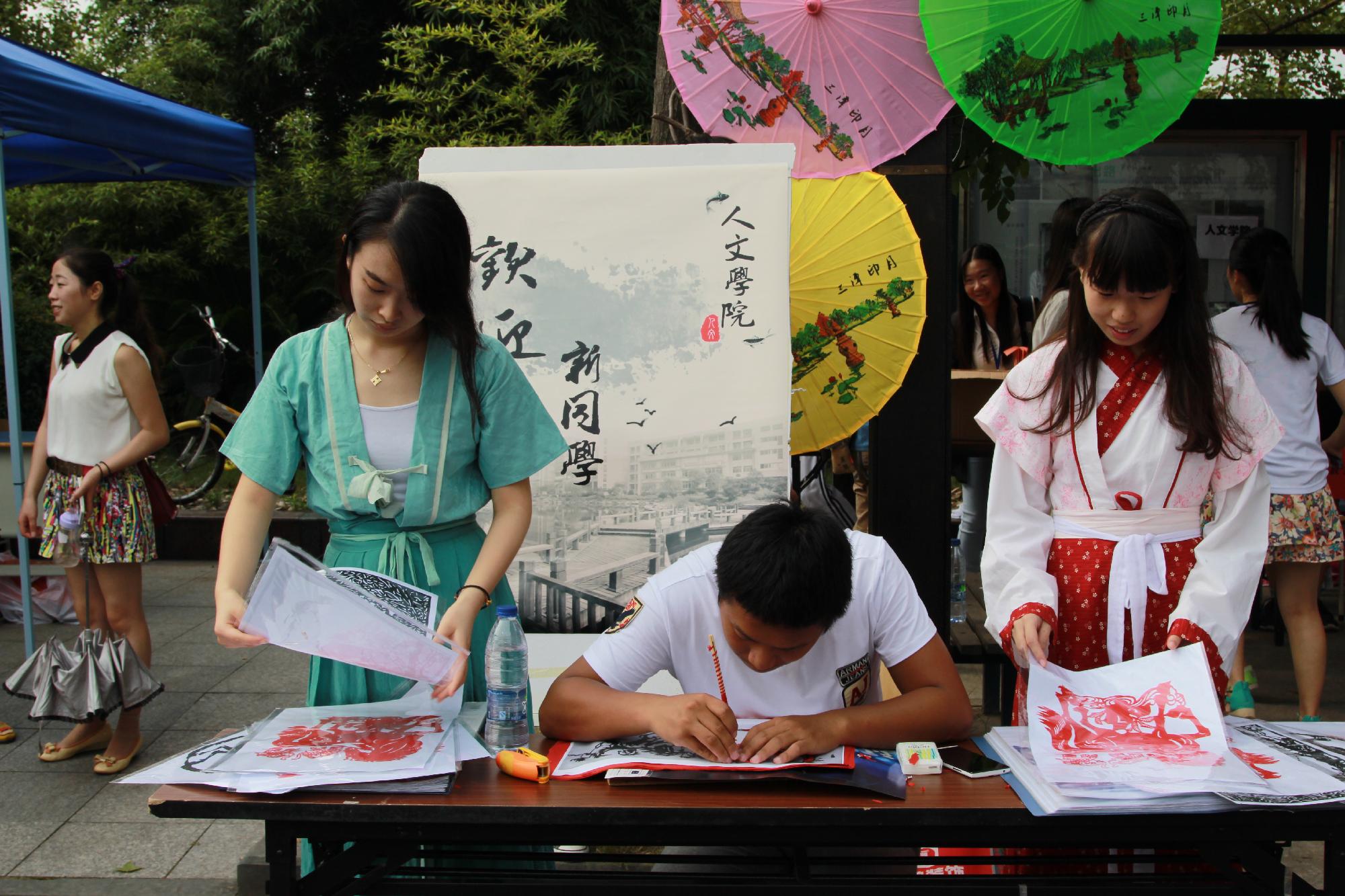 将汉服、剪纸、书法等体现中国传统文化元素的内容融入到迎新工作中,使新生一入校就受到中国传统文化的熏陶。迎新点两侧用画有三潭印月、西湖等美景的各色油纸伞进行装饰;正中央悬挂了一幅提名为“奋进”的书法作品,还附有一个新生签名墙;各专业助班穿上汉服来迎接新生;现场老生们还准备了书法和纸上篆刻表演,他们将作品赠送给各位家长、老师还有新生们,赢得了大家的喝彩。14级文学班的助班罗婷同学说:“人文爱游戏