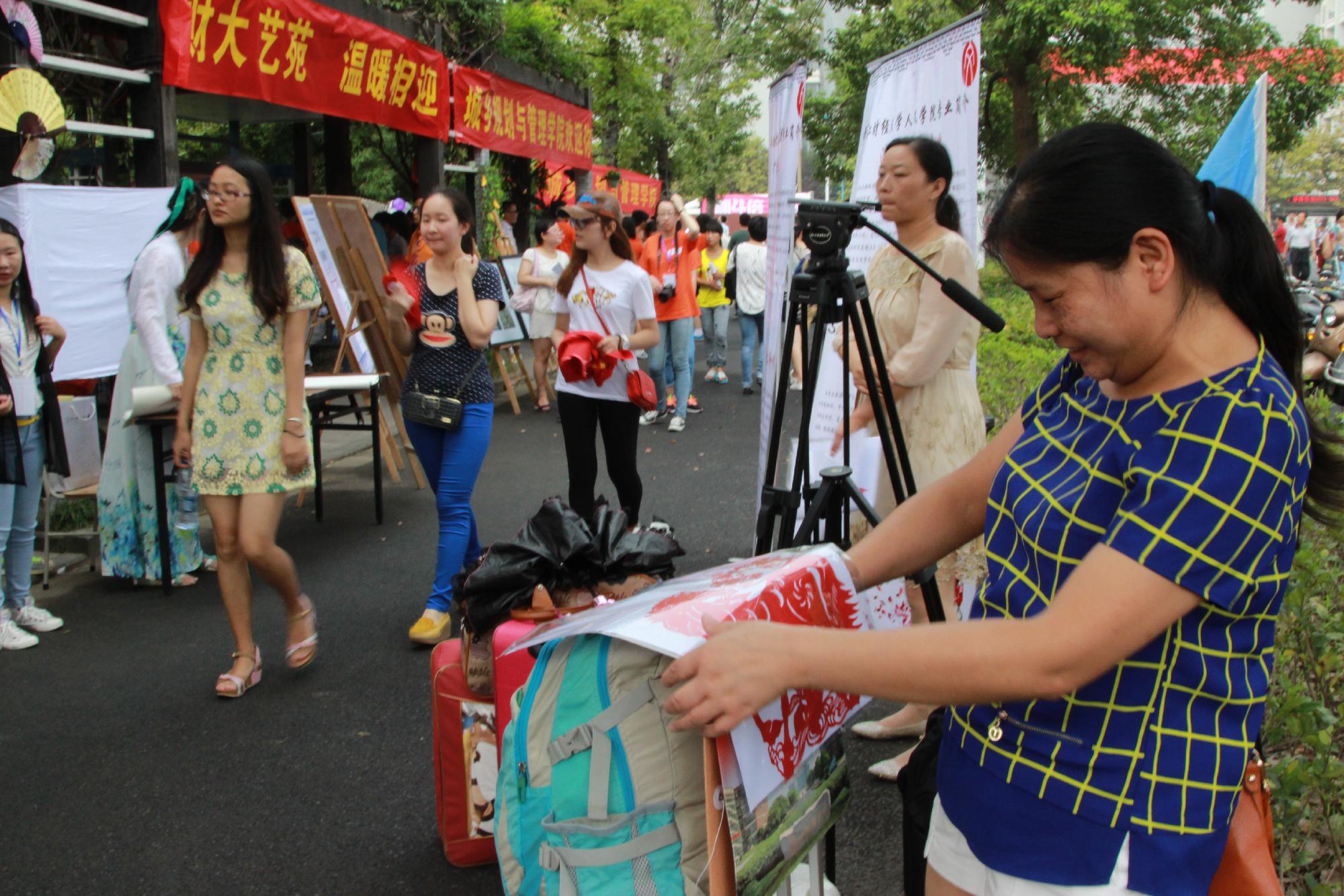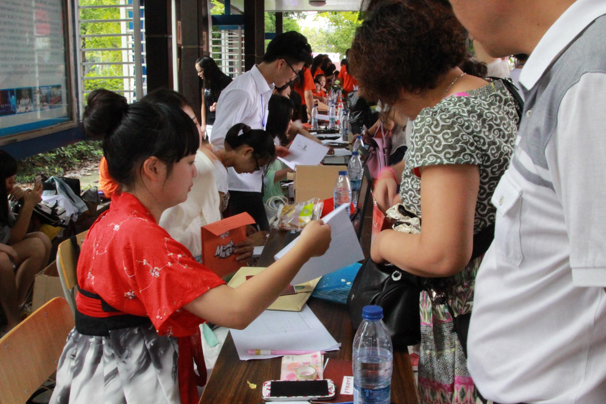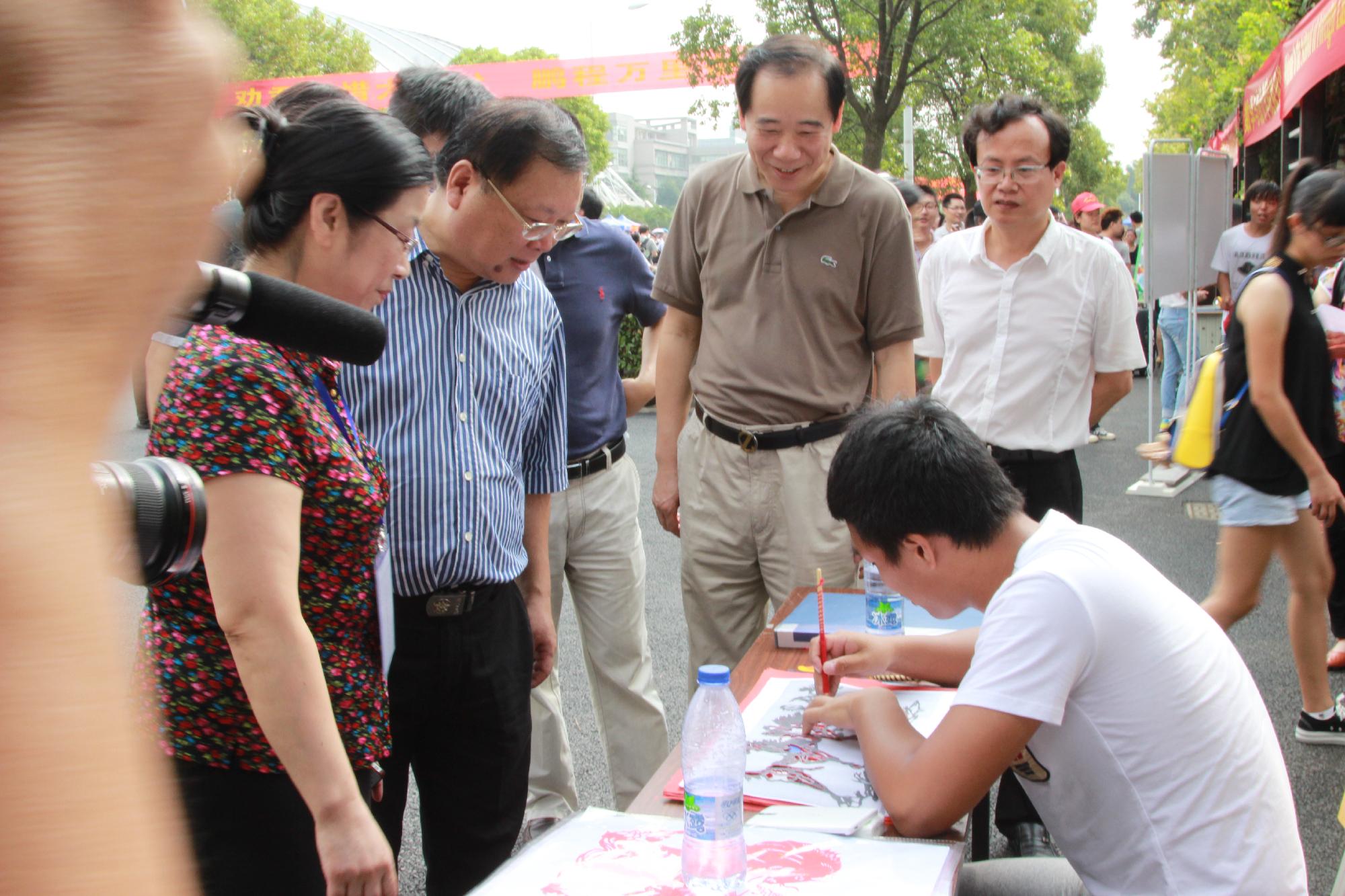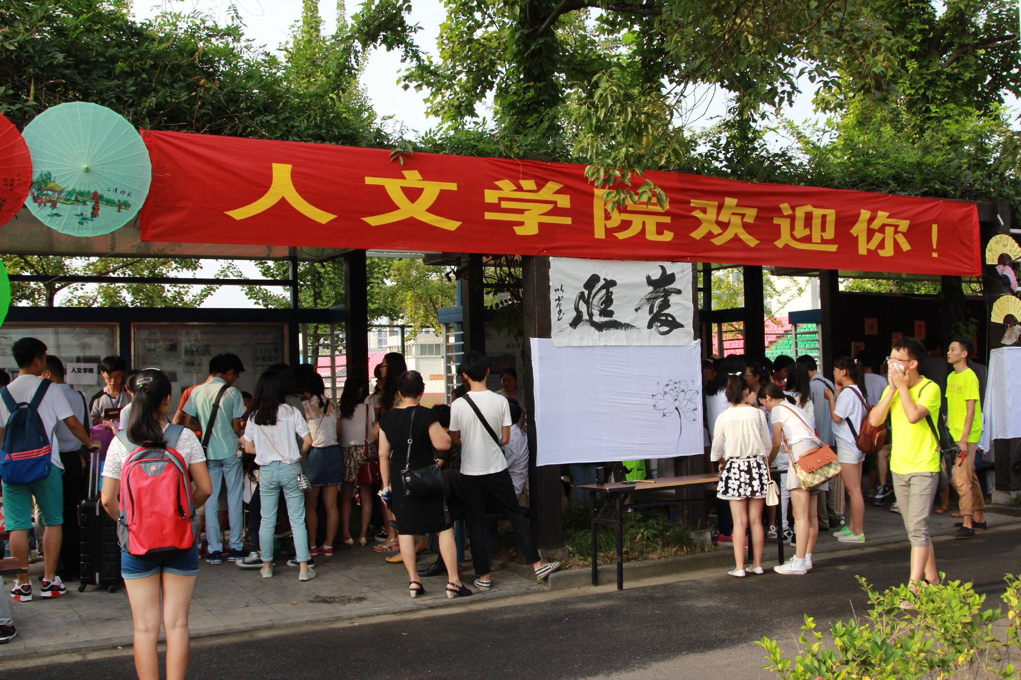 将汉服、剪纸、书法等体现中国传统文化元素的内容融入到迎新工作中,使新生一入校就受到中国传统文化的熏陶。迎新点两侧用画有三潭印月、西湖等美景的各色油纸伞进行装饰;正中央悬挂了一幅提名为“奋进”的书法作品,还附有一个新生签名墙;各专业助班穿上汉服来迎接新生;现场老生们还准备了书法和纸上篆刻表演,他们将作品赠送给各位家长、老师还有新生们,赢得了大家的喝彩。14级文学班的助班罗婷同学说:“人文爱游戏