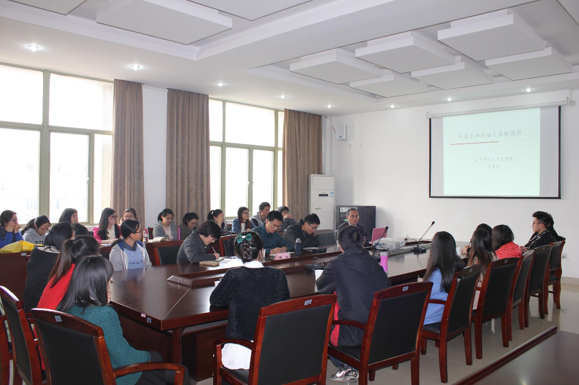 第二场报告题为《中国古典戏曲文本的阅读》。郭先生以《西厢记》、《牡丹亭》、《长生殿》的部分经典文本为据,提出并例证了文本阅读“读、思、疑、悟”四字诀,并就同学们提出的“如何阅读经典”等问题,做了进一步阐发。