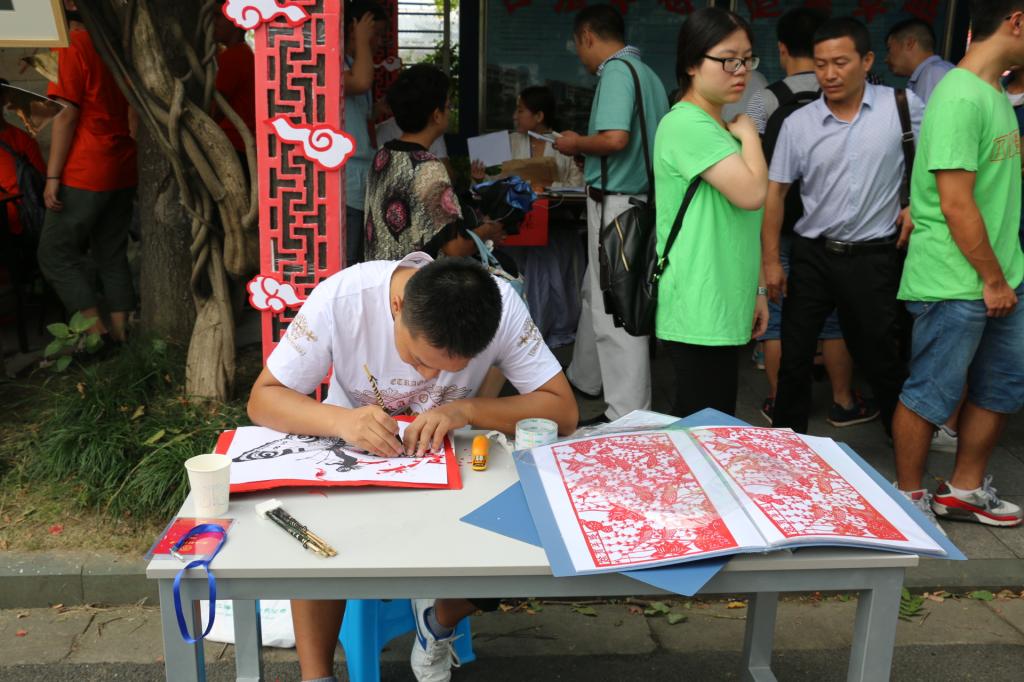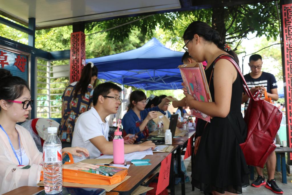 将汉服、剪纸、书法等体现中国传统文化元素的内容融入到迎新工作中,使新生一入校就受到中国传统文化的熏陶。新生接待处的横幅以及柱子上的雕栏,都是由手工剪裁出来的,每一个切口都是志愿者们汗水的结晶。班导们身着汉服,向新生们展现着民族文化的精华。现场志愿者们还准备了书法和纸上篆刻表演,他们将作品赠送给各位家长和新生们,赢得了学生与家长的喜爱,受到了领导们的赞赏。迎新活动每一个部分都让新生们感受到了中国传统文化的魅力,同时也让他们体会了人文爱游戏
