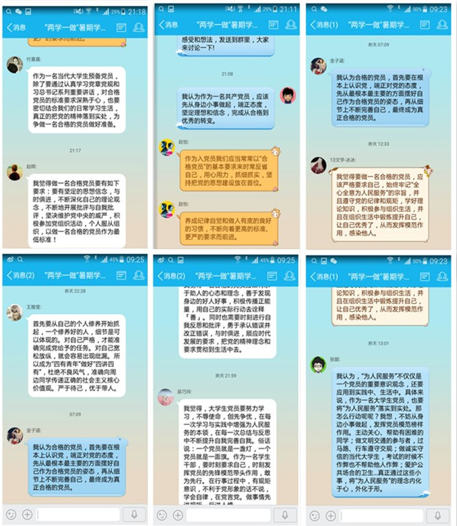 暑假期间,学生党员虽各自回家过假期,但学生第一党支部仍不忘继续加强“两学一做”学习教育,专门建立了“两学一做”学习交流群,不定期开展专题学习讨论,做到暑期“两学一做”学习教育不间断,提高学习成效。