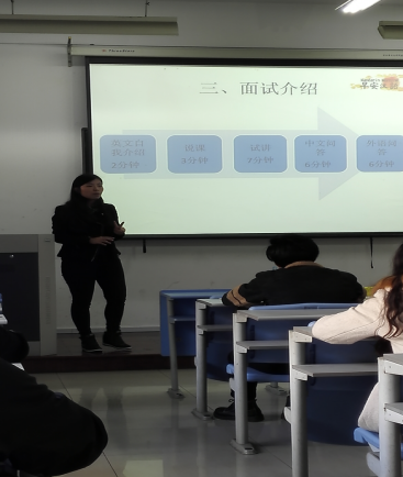 资深面试培训教师郭雯老师为汉语系的同学做了“七分钟出彩课堂”的讲座。国际汉语系铁徽博士主持,系主任孙德平副教授参加了讲座。