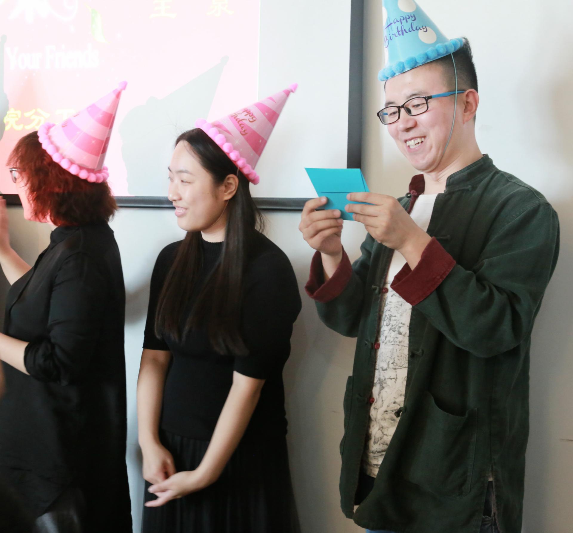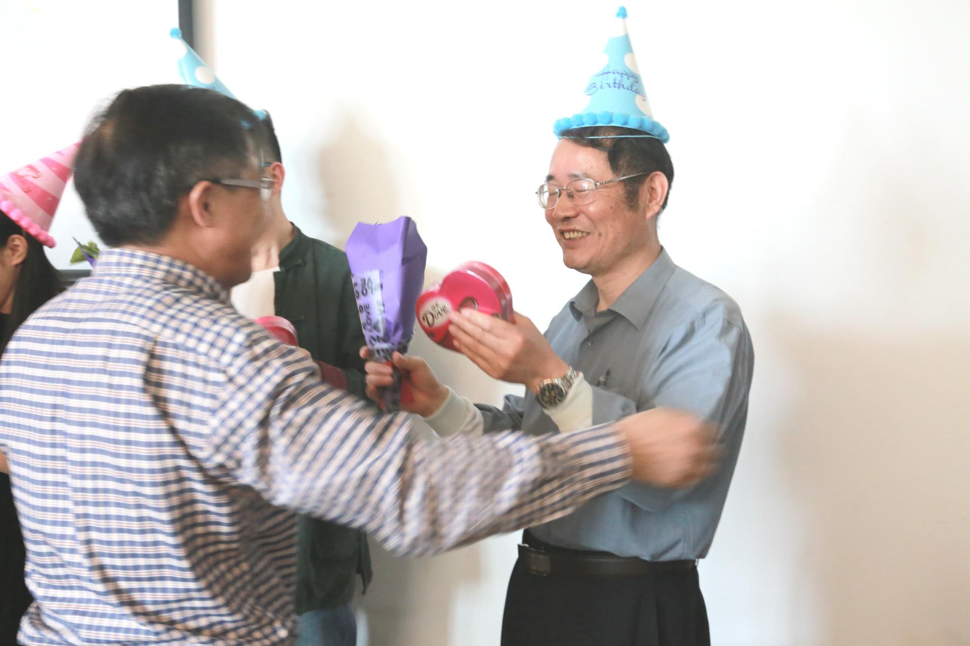 全体教职工的祝福歌声,院长何华珍和分工会主席陈朝霞为过生日的老师们送上了精美的鲜花、蛋糕、巧克力和贺卡。