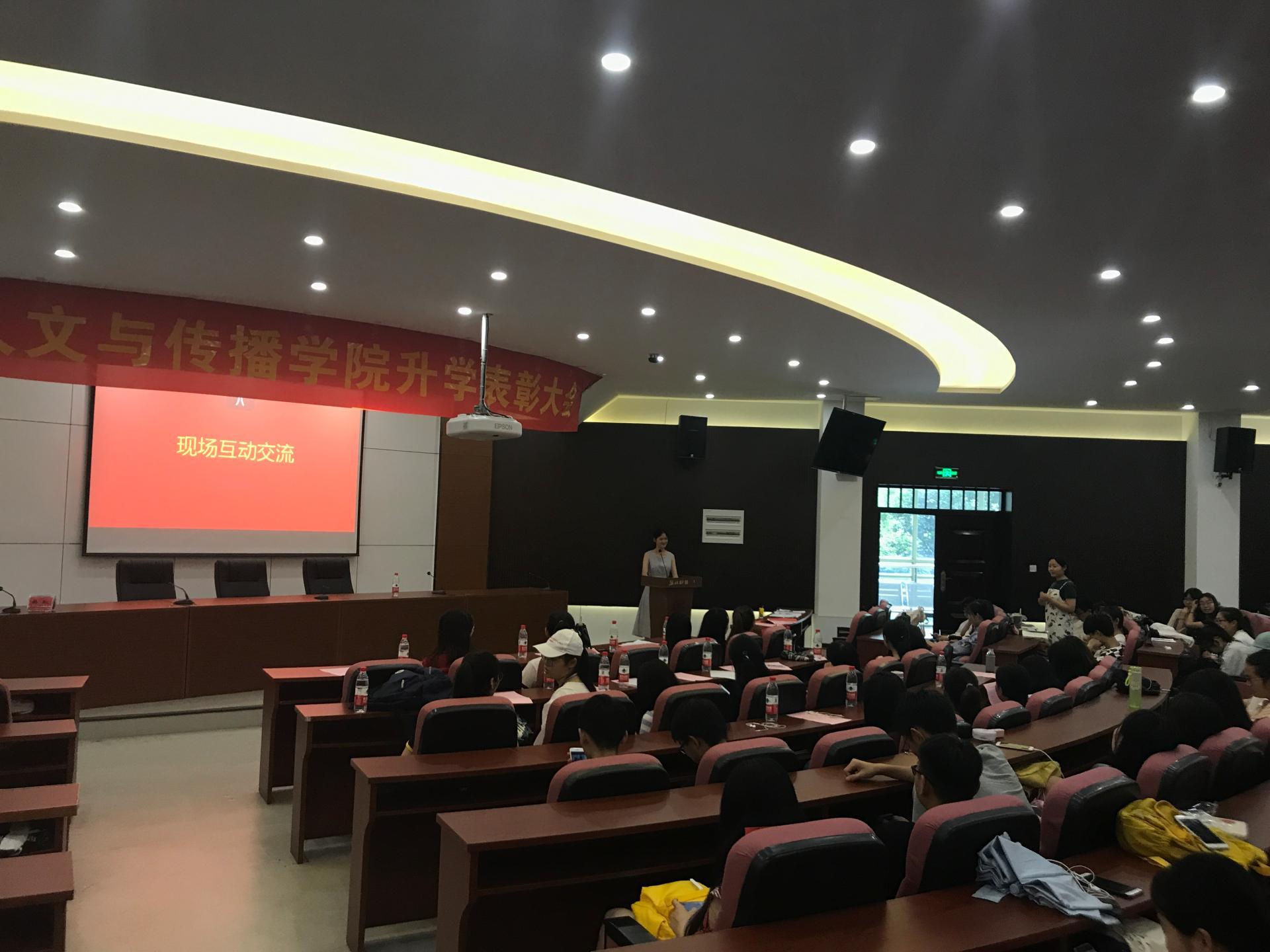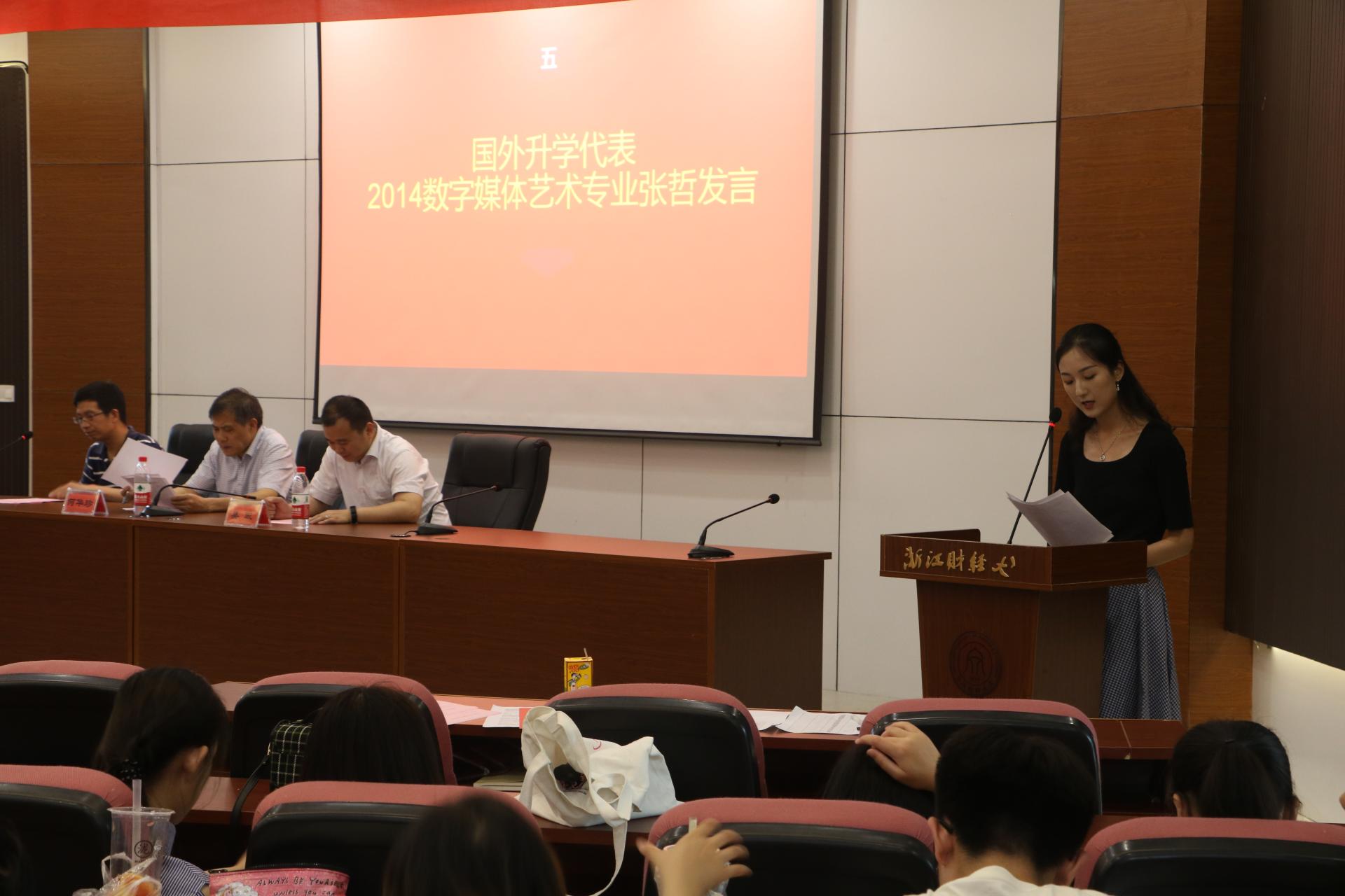 孙德平老师也对2018届考研(出国)学生表示祝贺,他希望同学们通过读书深造,给自己创造更多选择,追求并实现自己的梦想。2018届汉语言文学朱箫郡同学、2018届数字媒体艺术专业的张哲同学分别作为学生代表发言,分享了自己的心路历程和备考经验,为学弟学妹们提供了中肯实用的建议,并耐心解答了学弟学妹们提出的问题。