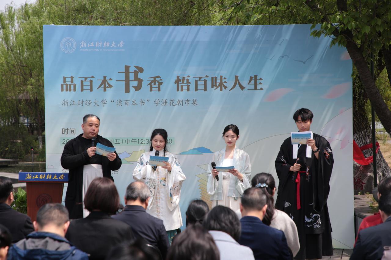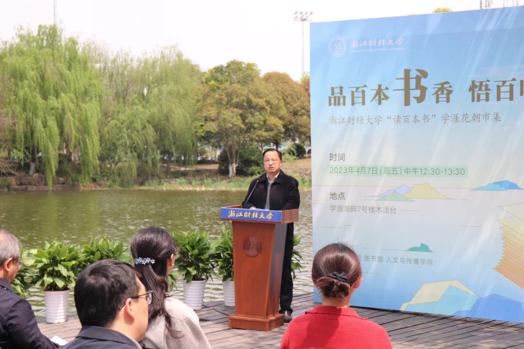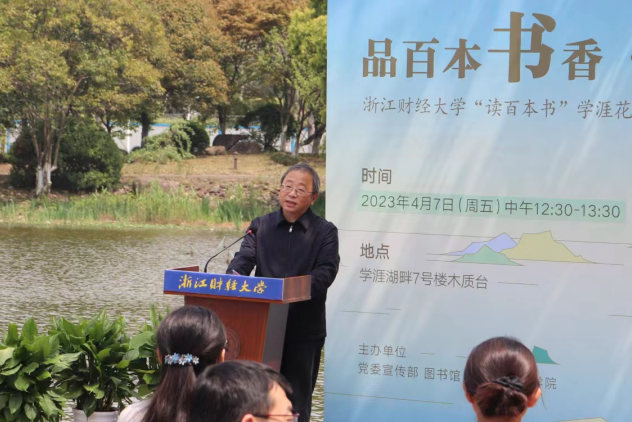读“百本书”活动历史悠久,作为在校学生的必修课,不仅丰富了学生课外生活,扩展了学生的知识面,为校园文化建设注入了活力,而且形成了富有特色、可持续发展的国家级校园文化品牌,体现了大学生回归读书初心的制度保障,使阅读好书成为每一位浙财学子的习惯。他从“为何要读书”“读什么书”“如何读书”三个方面阐释了开展“读百本书活动”的重要意义和作用。“书需要人去读,才能熠熠闪光;人需要多读书,才能顶天立地。”他强调,一个人的成长史一定有他的阅读密码,美好的青春时光需要书籍的陪伴和滋养。希望同学们怀着好奇心去读书,读古今中外经典名著,以书为友,常读常新,从而做一个健全发展的自由的人,希望浙财大的学生都能被熏陶成为一名真正的“读书人”。