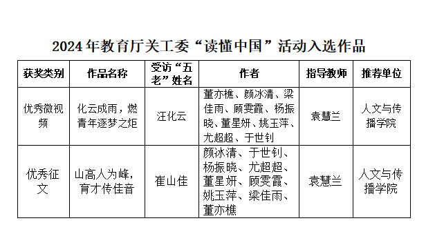 选送作品获评2024年“读懂中国”活动优秀微视频1个,优秀征文1篇。