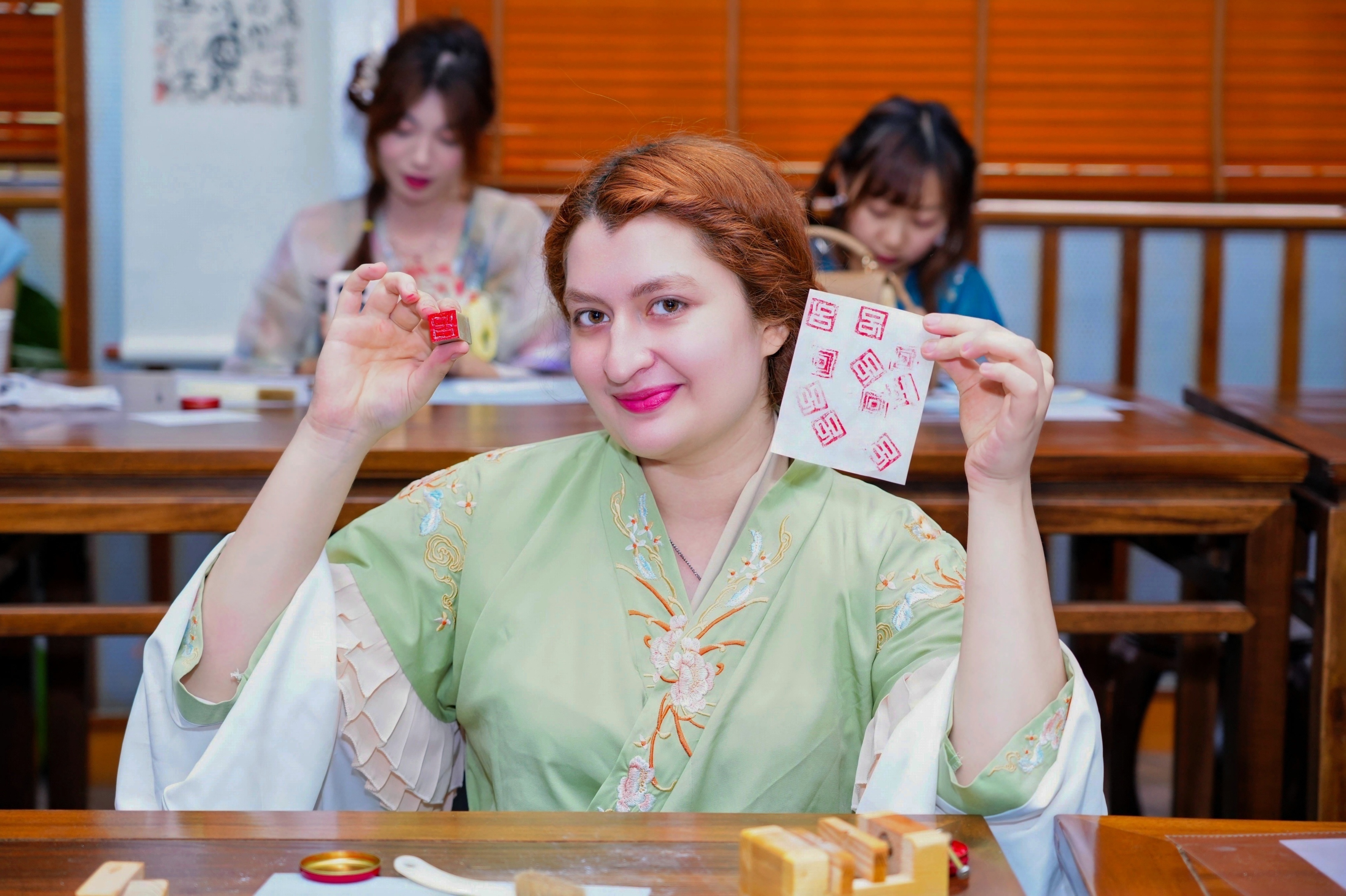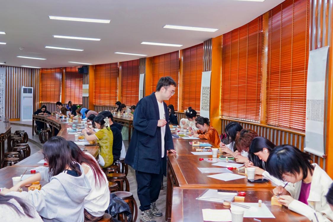 23级国际中文教育研究生吴昊泽身着唐制的齐胸襦裙,沉浸式体验本次活动,她表示:“在此次活动中,我仿佛穿越时空,触摸到古老汉字的灵魂。每一刀、每一划都蕴含着中华民族的智慧与力量,让我对汉字之美有了更深刻的理解,也让我更加热爱博大精深的中华文化。”