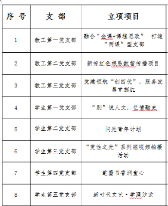 党委评审和后期完善,《融合“金课+课程思政” 打造“两课”型支部》、《新传红色根脉数智传播项目》、《党建领航“创四优”,服务发展党旗红》、《“剧”说人文,忆情融史》、《闪光青年计划》、《“党性之光”系列短视频拍摄活动》、《笔墨书香润童心》、《新时代文艺·学涯沙龙》等8个项目获得立项支持,爱游戏