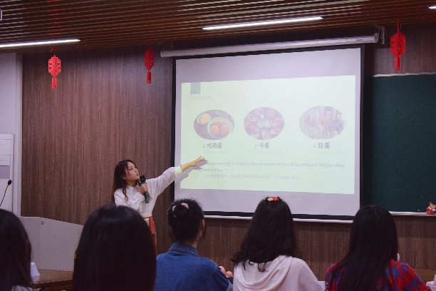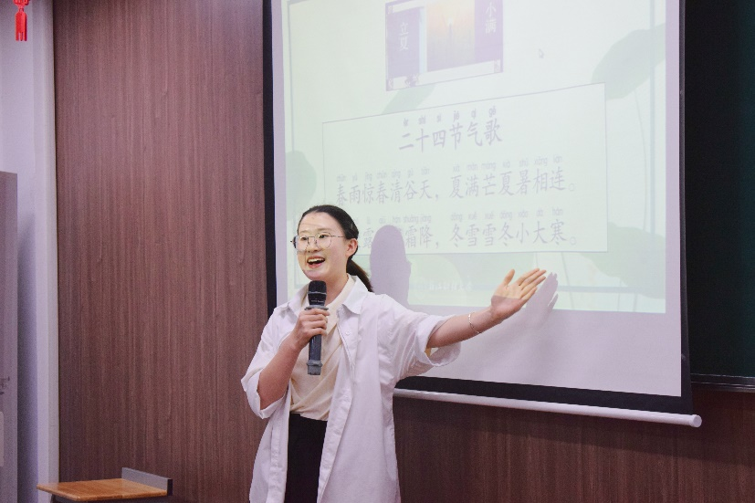 留学生辅导员陈思涵老师对此次活动流程进行了简单介绍。随后,我支部汉语国际教育专业研究生赵优、夏瑞和刘春燕同学分别用中英文向中外学生简单介绍了二十四节气的由来、时间、三候及对应的饮食习俗,并带领中外学生一起吟咏二十四节气歌。