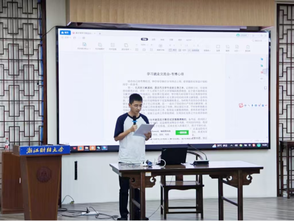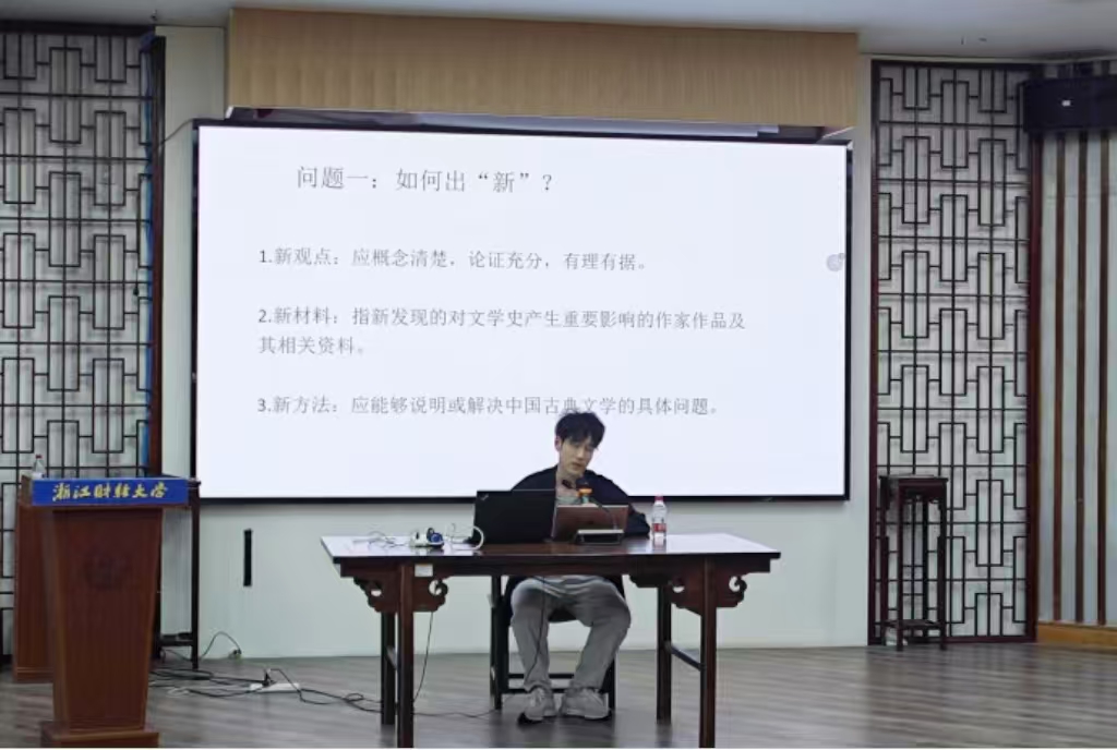 兰添学长以“硕士生如何完成一篇相对有新意的论文”为中心展开论文构思与撰写的经验分享。他将论文的创新点归纳为新观点、新材料、新方法三点,并将“以新视角找到新观点”视为硕士研究生更为可行的创新角度。他以个人发表的优秀论文《柳宗元散文读习与焦循的“文士”形象自塑》为例,阐述自己在论文写作过程中的方法和思路,为有志于发表论文的同学提供了宝贵的经验。