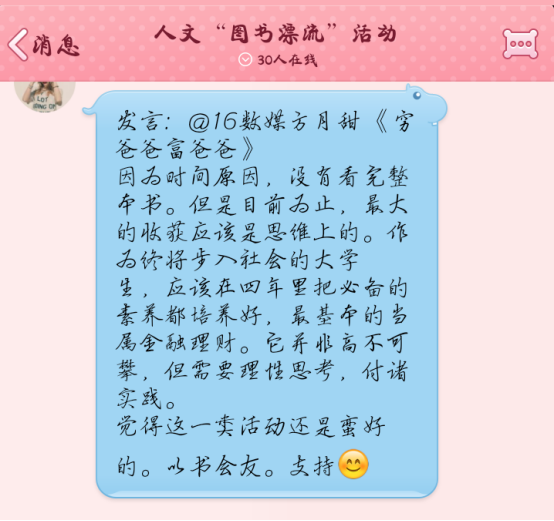 同学们以书会友,同时享受到了阅读的愉悦感,给寒冷的冬日带来了丝丝温情。最后每人将活动结果反馈到群里,互相表达感悟并交流。整个活动将持续两周,将评出一等奖2名,二等奖4名,三等奖6名。