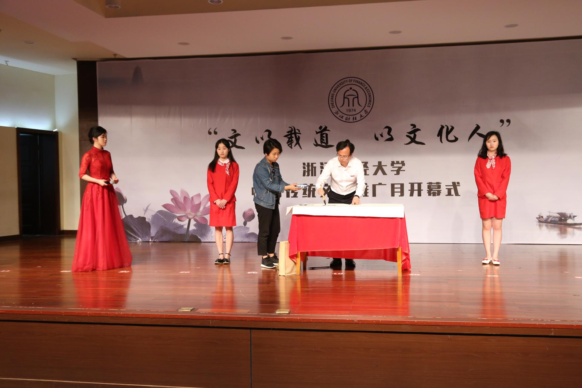 接下来,黄建新副校长为开幕式题词“文以载道”。在“文以载道”这四个字中,黄校长道出了中国传统文化推广的奥妙所在。