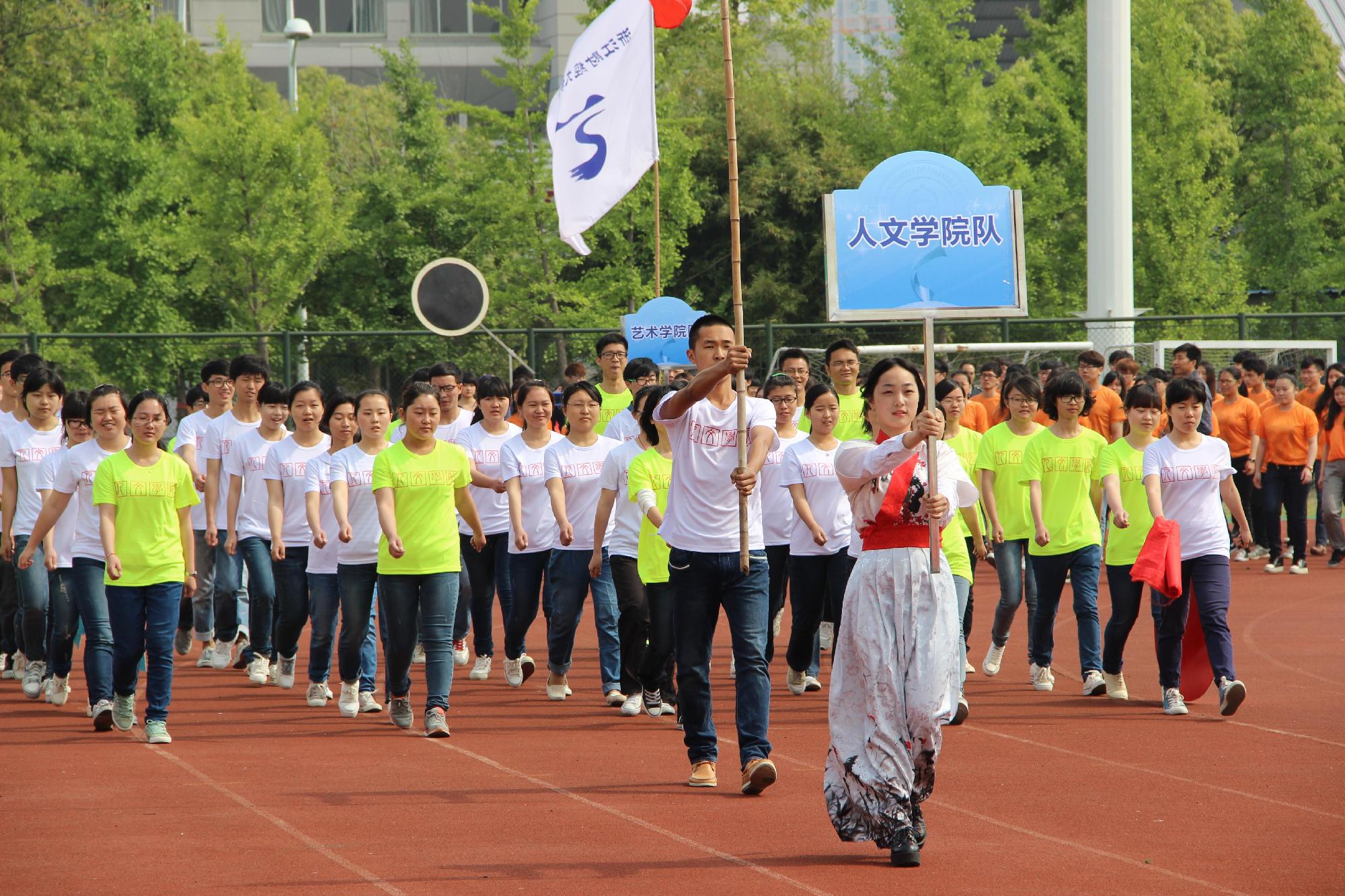 学子迈着整齐有力的步伐进入赛场,在主席台前站定后,方阵以变换队形的方式,用红色绸带先后拼成校徽和院徽,并以数字“1974”和“2014”表达人文爱游戏