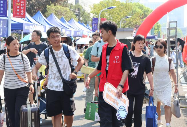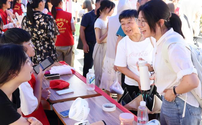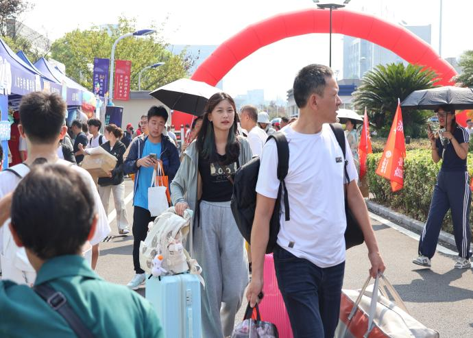 迎新工作人员、志愿者早早在摊位上做好准备,等待新同学的到来。积极地帮助新同学扫码报到,耐心地解答同学和家长们的问题,热心地帮忙运送行礼。