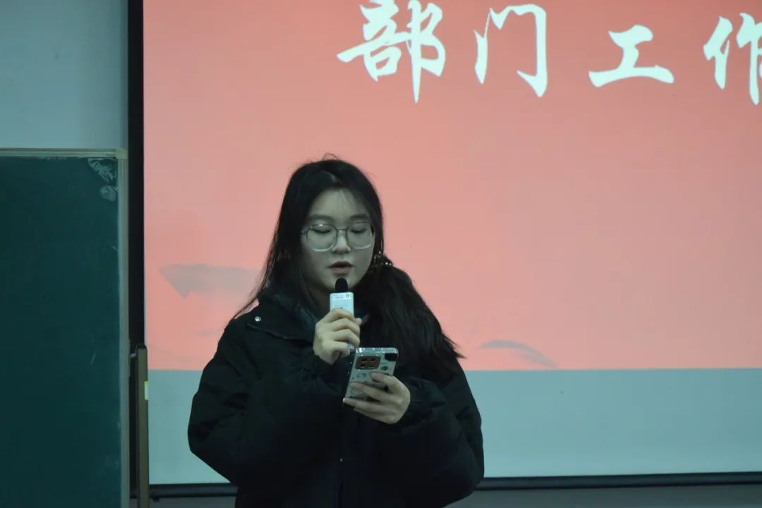 理论学习会结束后,各位团委学生会各部门负责人代表进行工作汇报,汇报内容包括近期部门工作主要内容以及本学期所取得的成果,并对部门现存问题进行了反思,针对薄弱环节提出整改措施,同时对后期工作进行了初步部署与规划,以更好推动团学部门工作有序开展。