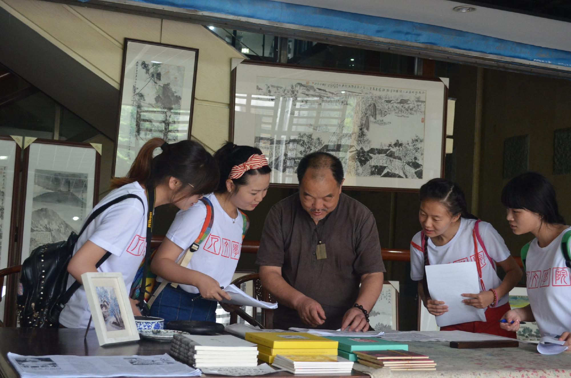 中国大运河博物馆、中国刀剑剪博物馆、中国扇博物馆等运河边的博物馆,是水上的运河文化在岸边的呈现。这些博物馆一方面是全方位、多角度反映和展现运河自然特性、人文精华等各个方面的大型博物馆,另一方面又是运河文物、文献资料等的征集、收藏中心和运河文化的研究和展示中心。代表队游览了博物馆各馆,亲身体会运河带给我们的历史故事。探索运河文化孕育下的民间艺术发展。在大运河博物馆里,同学们特别采访到了驻扎在博物馆中挥毫泼墨的“画说杭州第一人”——民俗画家吴理人老师。吴老师的画作生动地展示了老杭州历史,吴老师的讲解让大家对运河文化有了更贴切的认识。“2000年前,因工厂很多,脏乱差臭问题突出,现在也慢慢有所改善,适应了现代人的生活。大运河已经改变了很多,从破败转型到现在的发达······”说去运河的过去,吴老师感触颇深。谈到经常来博物馆参观的人群,老先生笑言有“三多”:大学生多、外来务工人员多、老人小孩多,并说如果什么时候来的中国老板多了,那中国文化的发展是真的有希望了。谈到运河申遗的影响,吴理人老师说来参观的人数有了明显增加,大学生群体最为明显。越来越多的人关注运河的变化和改造,也对运河的历史知识更感兴趣。而关于对运河未来的期许,吴老师寄语:“现代建筑少一点,古典气息浓一点,古色古香的建筑理应保留。新的希望在年轻人的身上,你们年轻人要多发扬运河文化。政府应该突出它的作用,建设并宣传博物馆,让参观的人能有所增加。带着所有杭州人乃至浙江人的祝愿和努力,京杭大运河变得越来越好!”